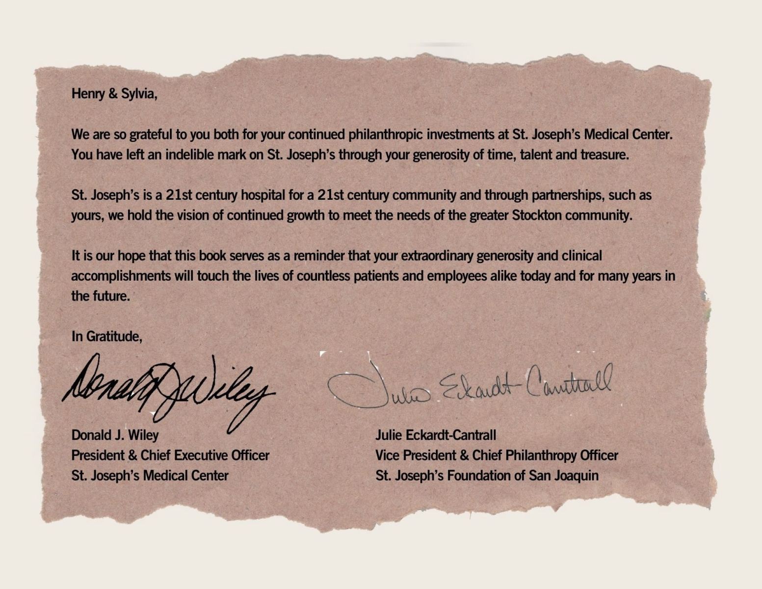 St. Joseph’s Medical Center recently crafted a heartfelt gratitude book to honor the remarkable philanthropic contributions of Henry and Sylvia, alongside the dedicated service of Dr. Wong. Through its carefully curated pages, this book tells the story of their unwavering commitment to advancing healthcare excellence and transforming lives within their community.